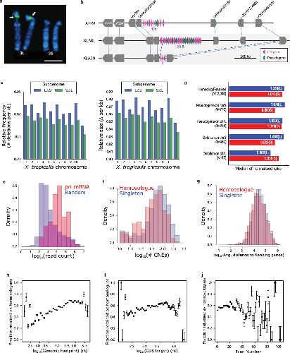 Figure 1. Chromosome evolution in Xenopus a. Comparative cytogenetic map of XLA and XTR chromosomes. Magenta lines show relationships of chromosomal locations of 198 homeologous gene pairs between XLAL and S chromosomes, identified by FISH mapping using BAC clones (Supplemental Table 1, see Supplementary Note 3.1). Blue lines show relationships of chromosomal locations of orthologous genes between XTR chromosomes and (i) both XLA L and S chromosomes (solid line) (lines between XLAL and S are omitted), (ii) only XLAL (dashed), or (iii) only XLAS (dotted), which were taken from our previous studies14,15. Light blue lines indicate positional relationships of actr3 and lypd1 on XTR9q and rpl13a and rps11 on XTR10q with those on XLA9_10LS chromosomes (see Supplementary Note 6.2). Double-headed arrows on the right of XLAS chromosomes indicate the chromosomal regions in which inversions occurred. Ideograms of XTR and XLA chromosomes were taken from our previous reports15,16.b. Distribution of homeologous genes (purple), singletons (grey), and subgenome-specific repeats across XLA1L (top) and XLA1S (bottom). Xl-TpL_Harb is red, Xl-TpS_Harb is blue, and Xl-TpS_Mar is green. Purple lines mark homeologous genes present in both L and S chromosomes, the black line marks the approximate centromere location on each chromosome. The homeologous gene pairs, from left to right: rnf4, spcs3, intsl2, foxa1, sds, ap3s1, lifr, aqp7. Each bin is 3 MB in size, with 0.5 MB overlap with the previous bin.c. Chromosomal localization of the Xl-TpS_Mar sequence. Hybridization signals were only observed on the S chromosomes. Scale bar shows 10 μm. |