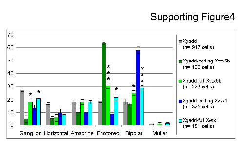 Figure S4. Functional Comparison between Constructs Carrying Coding and Coding Plus 3â² UTR of Xotx5b and Xvsx1 in Co-Lipofection Experiments with Xgadd-45γ Statistical analysis showing the proportion of lipofected cell types after lipofection of the constructs indicated in legend (Xgadd stays for Xgadd-45γ). âFullâ indicates constructs containing the coding region plus its 3â² UTR. These constructs were assembled by cloning the complete 3â² UTR sequence (see Materials and Methods) upstream of the coding sequence in the pCS2 vector. Number of lipofected cells are indicated by n. Error bars indicate standard error of the mean. Asterisks show the statistical significance of the differences between coding and coding +3â² UTRâcontaining constructs: Single asterisk indicates p ⤠0.05; triple asterisk indicates p ⤠0.001. https://doi.org/10.1371/journal.pbio.0040272.sg004 |