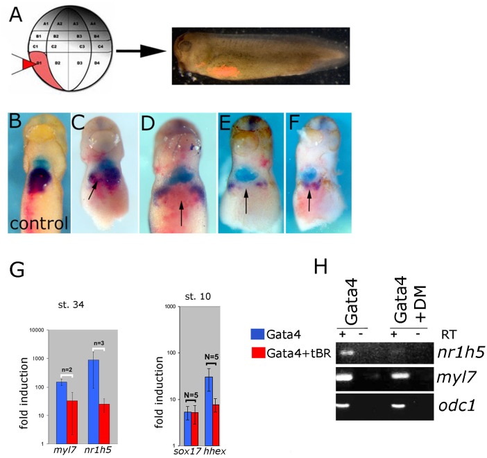 FIGURE 6. BMP signaling is required for liver development. (A) Design of the experiment. Lineage tracer was injected (B) alone or (CâF) with â¼30 pg/blastomere of truncated BMP Receptor (tBR) mRNA in dorso-vegetal blastomere D1 at the 32-cell stage. Heart and liver were revealed by double WMISH of myl7 (turquoise) and nr1h5 (purple). (CâF) four examples showing attenuation of liver fate specification in vivo following localized BMP inhibition by tBR (red-pink; pointed by arrows). N = 11, all showing effect on nr1h5 expression. Ventral views are shown, anterior is up. BMP signaling inhibition attenuates liver cell fate specification in Gata4 injected AC. (G) qPCR analyses of st. 34 explants show downregulation of nr1h5 as a consequence of BMP inhibition via tBR. At st. 10, tBR has no effect on the ability of Gata4 to induce sox17 but reduces hhex induction. (H) Treatment of Gata4-expressing AC explants with 30 μM dorsomorphin (DM) leads to downregulation of nr1h5.