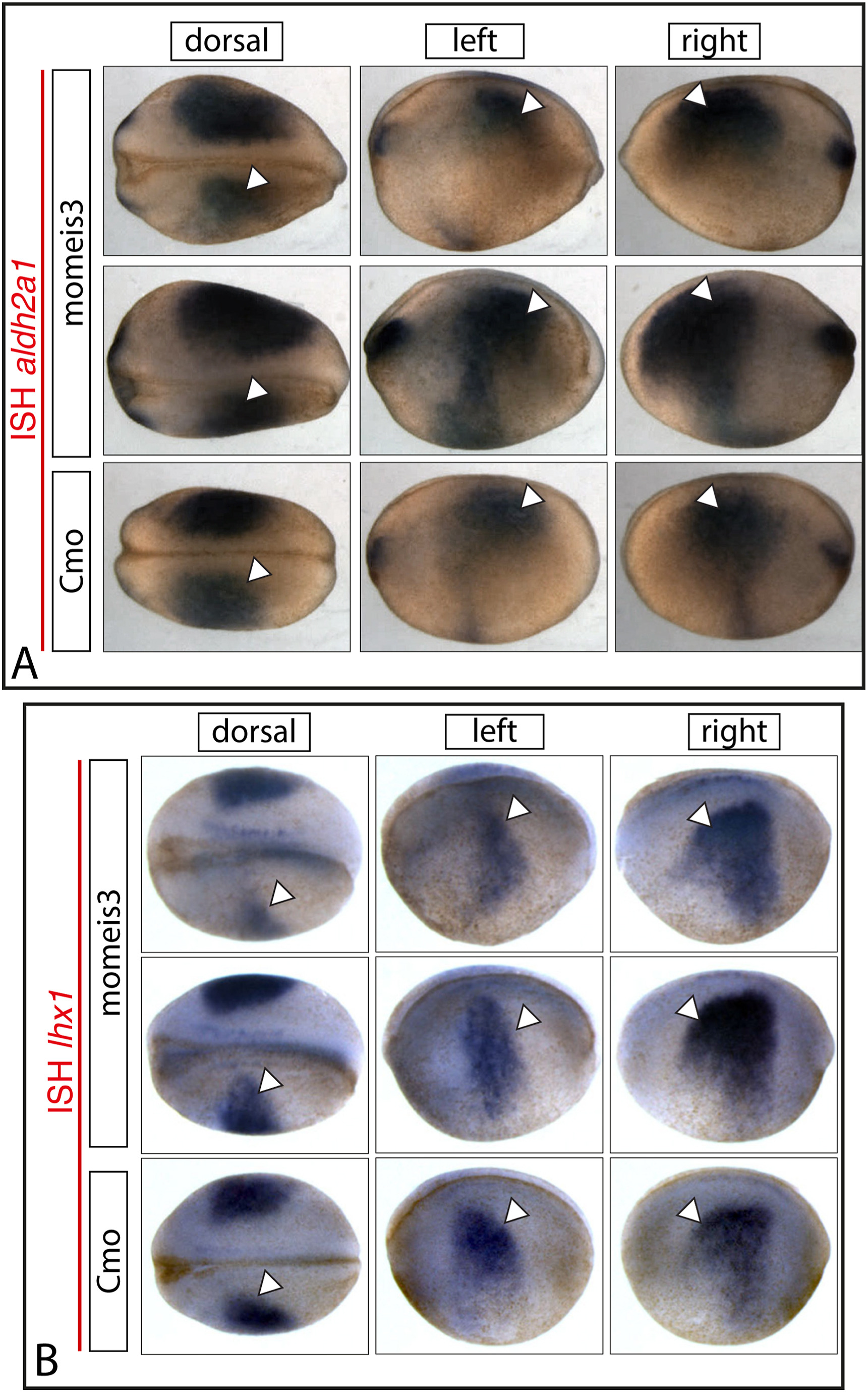 Fig. 4. Targeted meis3 depletion has a moderate effect upon aldh1a2 and lhx1 expression in the kidney field. A, B. Representative injected embryos showing aldh1a2 expression (A) or lhx1 expression (B). A. Adh2a1 expression is very dynamic and can vary from one embyo to the other. Yet comparing Momeis3 injected left side with control right side shows that expression domain in lateralmesoderm (arrowheads) is smaller on the injected side. This mild effect is not observed on embryos injected with a control morpholino (Cmo), although Cmo can slightly affect expression. B. Lhx1 expression is moderately inhibited as a result of Momeis3 injection. Lhx1 expression domain appears narrower. This is not observed after injection of Cmo, although Cmo can also slightly affect lhx1 expression.