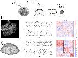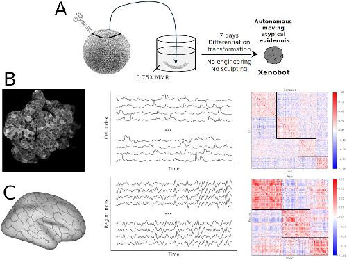 Figure 1. Data preparation and matrix construction. (A): This cartoon describes the production of basal Xenobots from frog embryonic tissue. Caps are excised by hand and cultured for seven days without perturbation; the resulting autonomously moving epidermal cell structure is a “basal” (i. e. unmodified) Xenobot. (B): The pipeline for learning functional connectivity patterns from basal Xenobots. Videos of the bots are segmented into individual cells, from which average calcium traces are extracted. The covariance matrix defines the functional connectivity, which can be organized into meso-scale communities following clustering. (C): The same pipeline, but for human brain data recorded with an fMRI; in this case, the elements are cortical regions (corresponding to the Schaefer 200 parcellation [Citation67]) and the signal is BOLD rather than calcium, but the overall pipeline remains the same.