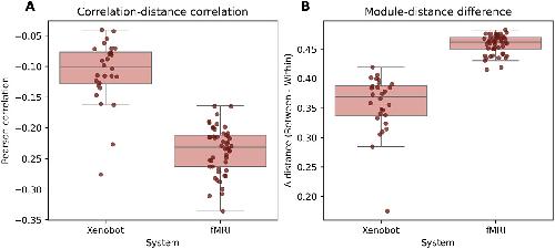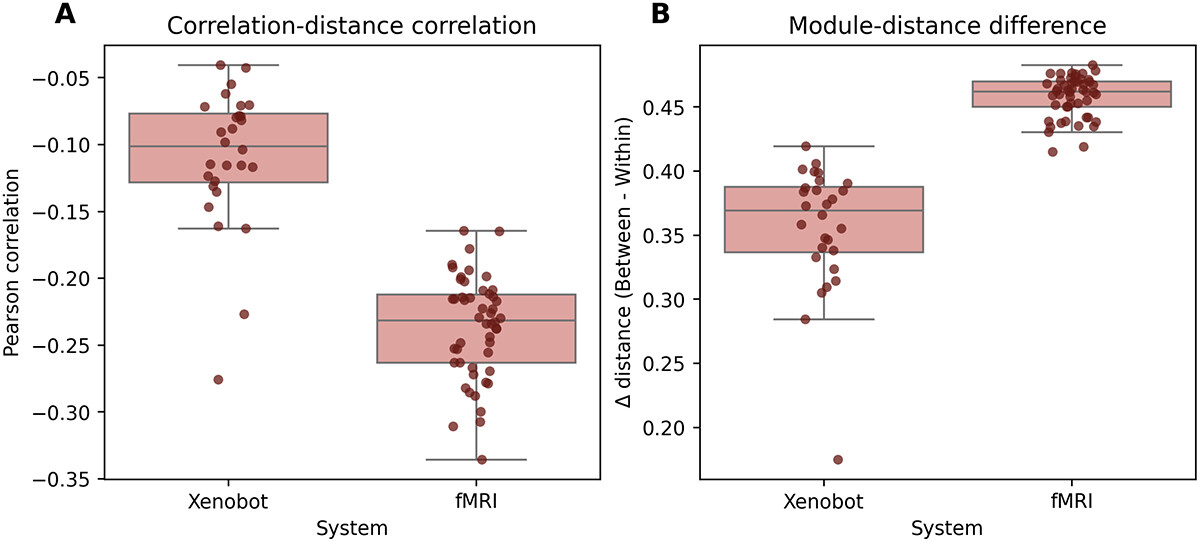 Figure 4. Spatial embedding of functional connections. (A) The Pearson correlation coefficient between the strength of a functional edge between two brain elements, and the Euclidean distance between them. Note that all correlations are negative, across all systems, showing a consistent drop off of functional integration with distance. (B) The difference between the average distance between elements that both reside within a single module and the average distance between elements in different modules. All differences were positive, showing that elements grouped within a functional module tend to be closer together than elements assigned to different modules. Collectively, these results show that the functional statistics are embedded in space in plausible ways: cells that are closer together tend to be more integrated and are more likely to belong to the same meso-scale community.