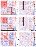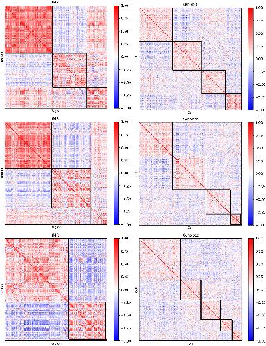Figure 3. Sample communities. A set of sample functional covariance matrices, organized by the communities detected by the multi-resolution community detection algorithm [Citation73] (see materials and Methods 3.5). The on-diagonal squares (outlined in black) correspond to the communities. Three fMRI and three basal Xenobot matrices are shown. The full set of all clustered functional connectivity matrices, for basal Xenobots and fMRI scans Supplementary material.