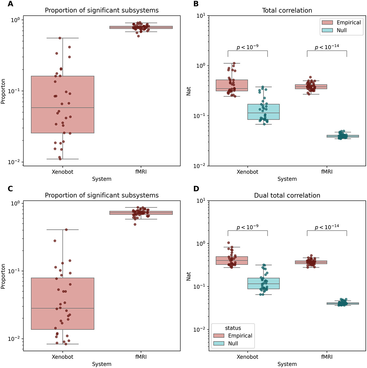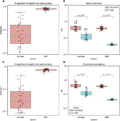 Figure 6. Higher-order information: total correlation and dual total correlation. (A) The proportion of subsystems of size 3, 4, and 5 that had significant total correlation for both basal Xenobots and fMRI scans. Both systems showed significant integration for multiple samples. (B) Both fMRI scans and basal Xenobots showed significantly greater total correlation [Citation79] than their autocorrelation-preserving nulls. (C) The proportion of systems of size 3, 4, and 5 that had significant dual total correlation [Citation80] for both system types. (D) Both fMRI scans and basal Xenobot recordings showed greater dual total correlation than their respective nulls.