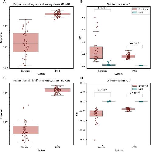 Figure 7. Positively- and negatively signed O-information. (A) The proportion of subsystems of size 3, 4, and 5 that had significant positive O-information (i.e. were significantly redundancy-dominated) for both basal Xenobots and fMRI scans. Both systems showed significant higher-order redundancy for multiple samples. (B) For positively signed samples, both fMRI scans and basal Xenobots showed significantly greater O-information than their autocorrelation-preserving nulls. (C) The proportion of systems of size 3, 4, and 5 that had significant negative O-information (i.e. were significantly synergy-dominated) for both system types. As with redundancy, both systems displayed significant synergy. (D) for negatively signed samples, both fMRI scans and basal Xenobot recordings showed more strongly negative O-information than their respective nulls.
