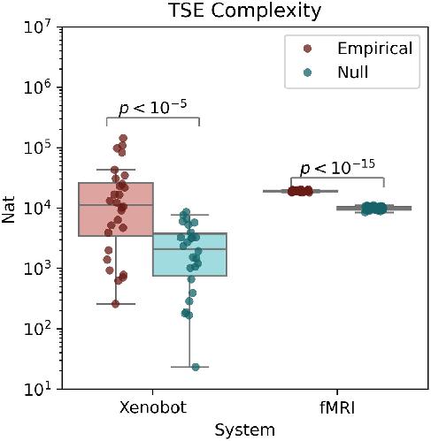 Figure 10. Integrated information (Φ𝑅). Both the basal Xenobots and the fMRI scans have significantly higher global integrated information than their respective nulls do. This shows that both systems display at least some dynamical properties in the “whole” that are not trivially reducible to lower-order “parts”.
