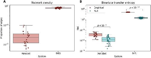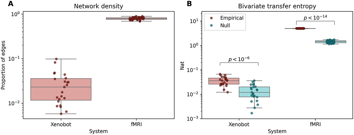Figure 9. Bivariate transfer entropy. (A) This plot shows the proportion of possible pairs (i.e. Of all possible 𝑋𝑖,𝑋𝑗∈𝑋) that showed significant transfer entropy. Both the fMRI scans and basal Xenobot recordings showed some multi-cellular directed information flows, although basal Xenobots were considerably sparser. (B) For both fMRI scans and basal Xenobot recordings, the empirical, significant transfer entropies were significantly higher than their respective circular shifted nulls.