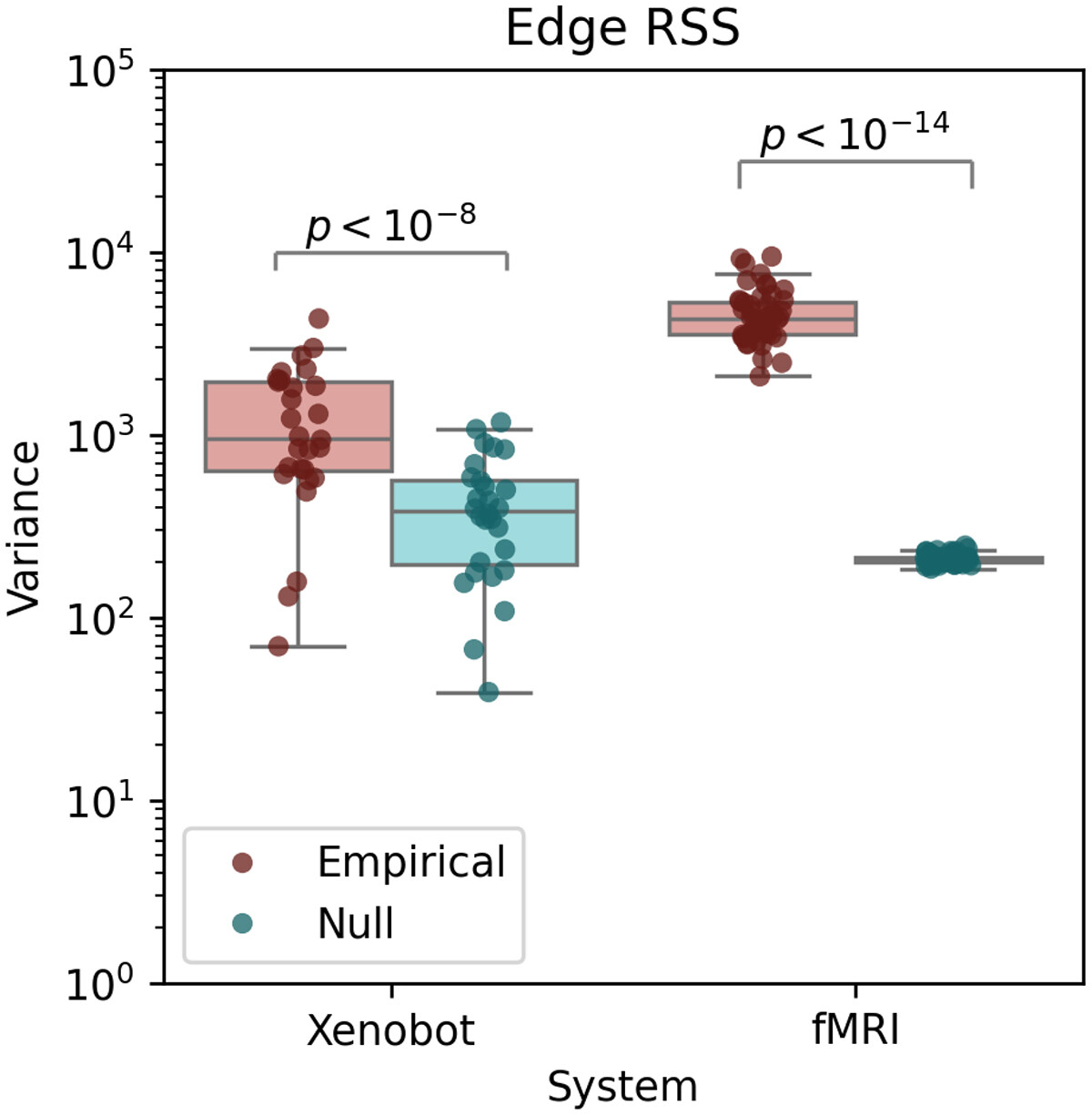 Figure 5. Variance in pairwise co-fluctuation magnitude. For both fMRI scans and basal Xenobot recordings, the variance of the RSS of co-fluctuation amplitude across all pairs of elements is greater than in the circular-shifted, autocorrelation-preserving nulls. These show that both fMRI scans and basal Xenobot calcium imaging data show transient, periods of both increased integration and increased segregation, indicating a kind of dynamical “richness”.