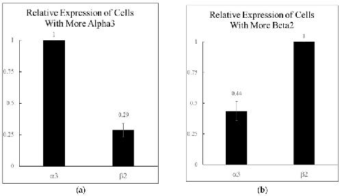 Figure 1. Relative levels of α3 and β2 nicotinic acetylcholine receptor (nAChR) mRNA expression in rat hippocampal interneurons. The most commonly co-expressed α and β subunits from Jackson et al. 2024 [6] were the α3 and β2 subunits (n = 36 neurons). These were analyzed further to identify two populations, depending on which subunit was expressed higher. (a) A total of 56% of the α3β2 expressing neurons had more α3, with a 3.45-fold α3:β2 mRNA ratio (n = 20 for (a)). (b) A total of 44% of the α3β2 expressing neurons had more β2 with a 2.27-fold α3:β2 mRNA ratio (n = 16 for (b)).