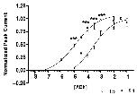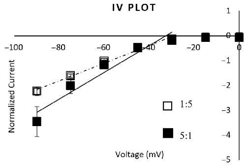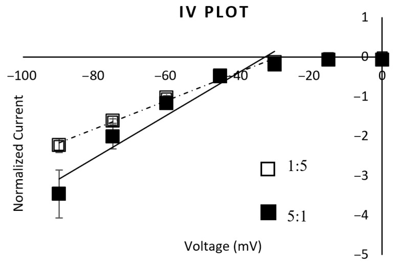 Figure 3. IV plot. The IV plot obtained from the α3:β2 1:5 mRNA-injected oocytes fit a linear trendline of y = 0.0356x + 1.033 (R2 = 0.9892) (dashed line, n = 5). The IV plot obtained from the α3:β2 5:1 mRNA-injected oocytes fit a linear trendline of y = 0.0537x + 1.7478 (R2 = 0.9362) (solid line, n = 8) when fitting the points between −90 mV and −30 mV (the linear part of the rectifying plot). The reversal potential for both is approximately −30 mV, with a strong inward rectification. ANOVA testing showed no significant difference between these IV responses.