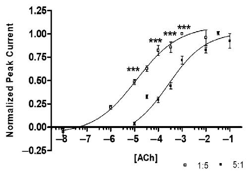 Figure 4. Acetylcholine (ACh) Dose–Response Curves: 1:5 (α3:β2) EC50 = 12.2 ± 1.7 μM, nH = 0.49 ± 0.13 (R2 = 0.74) (n = 14 oocytes, replicates of 4, 1 individual data point identified as an outlier and removed), 5:1 (α3:β2) EC50 = 263.8 ± 1.6 μM, nH = 0.55 ± 0.15 (R2 = 0.77) (n = 12 oocytes, replicates of 4, 2 individual data points outliers). Grubb’s outlier tests were used for outliers (alpha = 0.05). The 1:5 injected ratio has a minimum response at ~100 nM and an Emax at ~1000 µM ACh. The 5:1 injected ratio has a minimum response at ~10 µM and an Emax at ~33 mM ACh (ANOVA, F[15,258] = 54.644, *** p < 0.001).