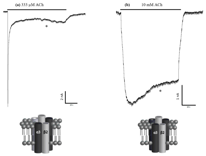 Figure 2. Sample traces and likely stoichiometries. Injection of hα3 and hβ2 nicotinic acetylcholine receptor (nAChR) mRNA into Xenopus laevis oocytes at ratios of (a) 1:5 and (b) 5:1 formed functional and kinetically distinguishable receptors. The respective oocytes were perfused with 333 µM and 10 mM acetylcholine (ACh) (EC85) for up to 60 s to characterize desensitization. The percentage of the peak currents remaining after 30 s of sustained ACh application (30 s mark indicated by *) were compared and showed a significant difference between the two injected α3β2 ratios (see also Figure 1). Graphical representations of the likely potential stoichiometries are shown below each respective electrophysiological trace (i.e., either α3(2) + β2(3) or α3(3) + β2(2)), modeled on what is already published about stoichiometries for α4β2 and the α2β2 nAChRs [16,33,34,35].
