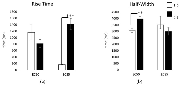 Figure 5. Comparison of rise times and half-widths. Comparisons were made at the EC50 (10 µM, 333 µM acetylcholine) and the EC85 (333 µM, 10 mM) for the 1:5 and 5:1 α3:β2 mRNA-injected ratios, respectively, using t-tests for significance. (a) Comparison of 10% to 90% rise time: 1:5 10 µM (x¯ = mean ± SEM) x¯ = 1166 ± 237 ms (n = 6, replicates of 3), 333 µM x¯ = 169 ± 9 ms (n = 21, replicates of 4, 3 replicate outliers removed), 5:1 333 µM x¯ = 821 ± 123 ms (n = 13, replicates of 4), 10 mM x¯ = 1424 ± 171 ms (n = 25, replicates of 4, 3 replicate outliers removed). (b) Comparison of half-width: 1:5 10 µM x¯ = 3084 ± 130 ms (n = 5, replicates of 3, 3 replicate outliers removed), 333 µM x¯ = 3522 ± 654 ms (n = 11, replicates of 4), 5:1 333 µM x¯ = 3988 ± 163 ms (n = 13, replicates of 4, 2 replicate outliers removed), 10 mM x¯ = 3003 ± 297 ms (n = 21, replicates of 4) (** p < 0.01, *** p < 0.001). Grubb’s outlier tests were used to identify significant outliers (alpha = 0.05).