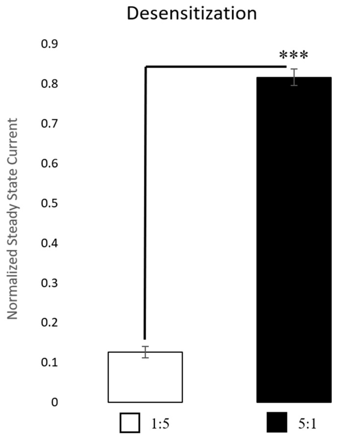 Figure 6. Desensitization. Comparisons were made after 30 s of continuous acetylcholine (ACh) application at the EC85 for each receptor subtype. The 1:5 α3:β2-injected oocytes (n = 7 oocytes, performed in replicates of 3 traces, 1 replicate outlier removed) were much more desensitized, withless current remaining compared to the original peak, while the 5:1 α3:β2-injected oocytes (n = 3 oocytes, performed in replicates of 3 traces, 1 replicate outlier removed) were only desensitized minimally with much of the current remaining at 30 s compared to the original peak. Outliers were identified using Grubb’s outlier test (alpha = 0.05). A t-test was used to test for the significance of the amount of peak current remaining after 30 s of ACh administration (*** p < 0.001).