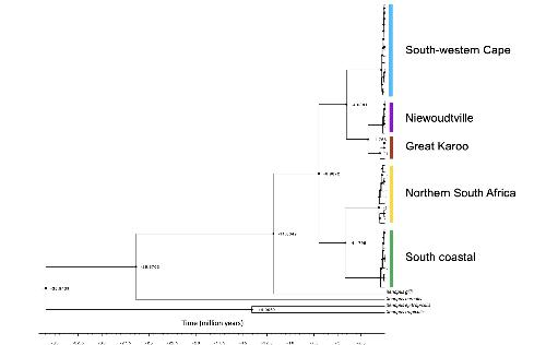 Fig. 4. Dated mitochondrial phylogeny. The Calibrated Bayesian tree of mitogenome sequences was set on the divergence between Silurana and Xenopus estimated based on molecular and fossil data to be around 36Mya (27-51Mya)