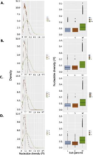 Fig. 5. Comparison of nucleotide diversity between the L and S sub-genomes around exons. The left side of each panel shows the density distribution of nucleotide diversity for exons located on the L and S sub-genomes as well as for the whole genome average (W). The right side shows the same data as boxplots. A- All exons combined. B- First exons. C- Last exons. D- Single exon genes. The listed colors in the vignettes are light blue for the L sub-genome, brown for the S sub-genome, and green for whole genome data