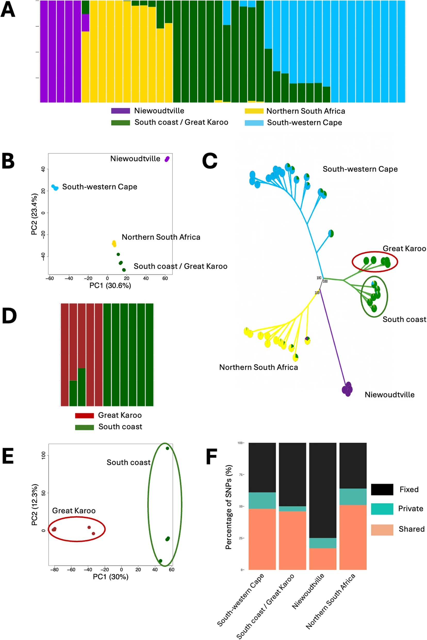 Fig. 1. Population structure of Xenopus laevis in South Africa. A- STRUCTURE analysis showing 4 main clusters (K = 4). Each vertical bar represents one individual, and the proportion of colour within each bar indicates the individual’s estimated ancestry to each genetic cluster. The left ladder marks the proportion scale. B- PCA of SNP data showing the first two principal components (PC1 and PC2), which accounts for 30.6% and 23.4% of the total genetic variation respectively. Each point represents an individual, and clustering patterns reflect genetic similarity. C- Maximum likelihood phylogeny. D- STRUCTURE analysis showing that the Great Karoo and south coastal populations are genetically distinct. E- PCA of SNP data based on the Great Karoo and south coastal populations showing PC1 and PC2, which accounts for 30% and 12.3% of the total genetic variation respectively. F- Proportion of fixed, shared and private SNPs among populations