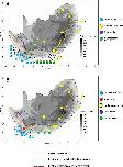 Fig. 2. Geographic partitioning of genetic variation of Xenopus laevis in South Africa. A- Distribution of genetic variation based on nuclear SNPs. B- Distribution of mitochondrial clades. Numbers indicate the number of individuals from the same locality that harbour the same genetic composition