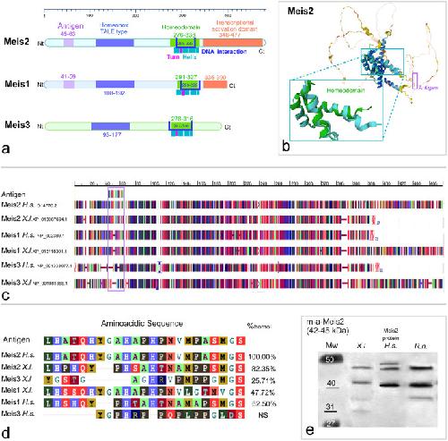 Figure 1. (a) Representation of the structure and main domains of the human Meis2, Meis1, and Meis3 proteins. The domains are labeled in Meis2 and the color code is maintained in Meis1 and Meis3. (b) The 3D structure obtained from the AlphaFold Protein Structure Database and PDBe-KB (Protein DATA Bank in Europe Knowledge Base) for human Meis2 Uniprot Id: O14770.2 Entrez Gene ID: 4212. The central part, including the homeodomain (cyan rectangle) and the Nt loop, contains the antigenic sequence recognized by the antibody used (violet rectangle). (c) Alignment of the Meis1, Meis2, and Meis3 orthologs between Homo sapiens and Xenopus laevis. (d) Percentage of homology with the amino acid sequence of the antigenic epitope for the Meis1, Meis2, and Meis3 orthologs in Xenopus laevis and Homo sapiens. (e) Western blot analyses of brain extracts from Xenopus (X.l), dilution of the purified Meis2 human protein (H.s), and Rattus norvegicus (R.n), stained with the mouse anti Meis2 antibody. Standard molecular weight (MW) is represented on the left side of the photograph.