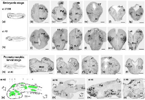 Figure 3. Photomicrographs of Meis2-ir transverse (a–t) and sagittal (u–x) sections at representative brain levels of Xenopus during embryonic stages. Topological dorsal and rostral orientations are indicated by rows, with respect to the alar-basal boundary (ABB). Stages 37–38 (a–g), 42 (h–n), and 46 (o–q) are indicated on each photomicrograph. The approximate levels of transverse sections are indicated in (u). Dashed lines mark the approximate boundary between neuromeres and telencephalic subdivisions. See the list for abbreviations. Scale bars = a–n =50 μm, p–t, v–x = 100 μm = 200 μm.