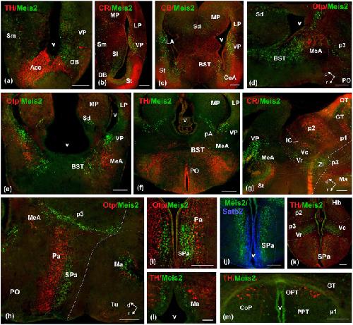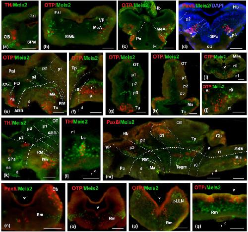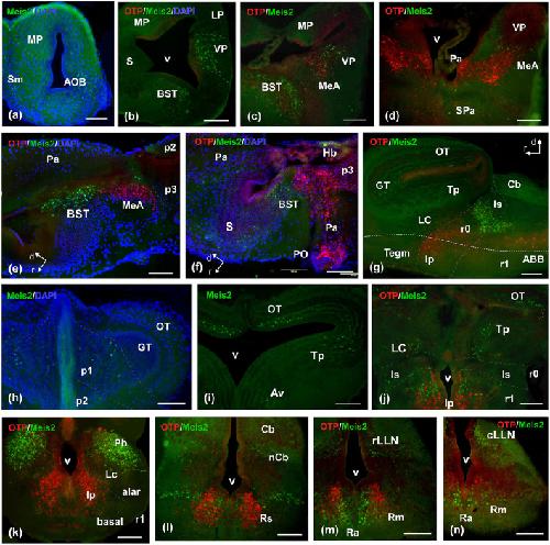 Figure 5. Photomicrographs of double-labeled transverse (a–d, h–n) and sagittal (e–g) sections at representative brain levels of Xenopus from stages 53–56. Topological dorsal and rostral orientations are indicated by rows, with respect to the alar-basal boundary (ABB), indicated by a rough dashed line in sagittal sections. In all photographs, green is Meis2ir, red is Otp, and blue is DAPI staining. Thin dashed lines represent the approximate boundaries within telencephalic, diencephalic, mesencephalic, and rhombencephalic subdivisions. See the list for abbreviations. Scale bar, all = 100 μm.