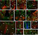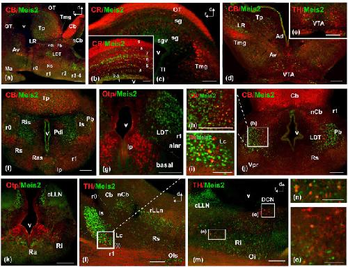Figure 8. Photomicrographs of double-labeled transverse (a–c, e, f, i–m) and sagittal (d, g, h) sections at representative brain levels of Xenopus from stages 53–56. Image (h) is a magnification of (j) at the level of the laterodorsal nucleus. (i) is a magnification of the locus ceruleus in (l). Images (n) and (o) are magnifications of (m) at the reticular formation and DCN respectively. Topological dorsal and rostral orientations are indicated by rows. The alar-basal boundary (ABB) is indicated by a rough dashed line in sagittal sections. Color codes for the markers are indicated in the upper left corner of each photo. Thin dashed lines represent the boundaries within telencephalic, diencephalic, mesencephalic, and rhombencephalic subdivisions. See the list for abbreviations. Scale bar, no = 25 μm, rest = 100 μm.