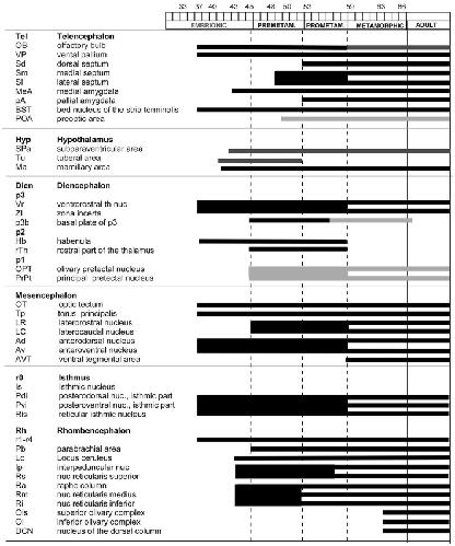 Figure 10. Timeline of the appearance of Meis2 cell groups in the developing brain of Xenopus laevis.