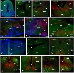 Figure 7. Photomicrographs of double-labeled transverse (a–c, e, f, i–m) and sagittal (d, g, h) sections at representative brain levels of Xenopus from stages 53–56. Topological dorsal and rostral orientations are indicated by rows, with respect to the alar-basal boundary (ABB), indicated by a rough dashed line in sagittal sections. Color codes for the markers are indicated in the upper left corner of each photo. Thin dashed lines represent the approximate boundaries within telencephalic, diencephalic, mesencephalic, and rhombencephalic subdivisions. See the list for abbreviations. Scale bar, all = 100 μm.