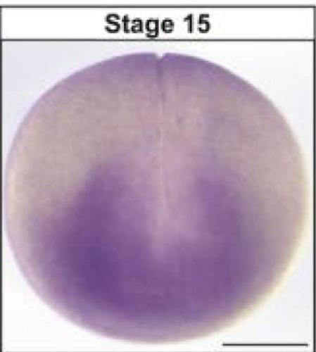 wdr5 (WD repeat domain 5) gene expression in X. laevis embryo, NF stage 15, assayed via in situ hybridization, anterior view, dorsal up.