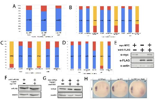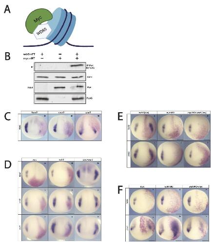 phenotype counts for myc nMT, wdr5 MO, and myc nMT+wdr5 MO injected embryos. (E) Western blot