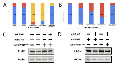 bar graph representing whole embryo phenotype counts for wdr5 MO, wdr5 nFT, wdr5-WINF133A nFT,wdr5