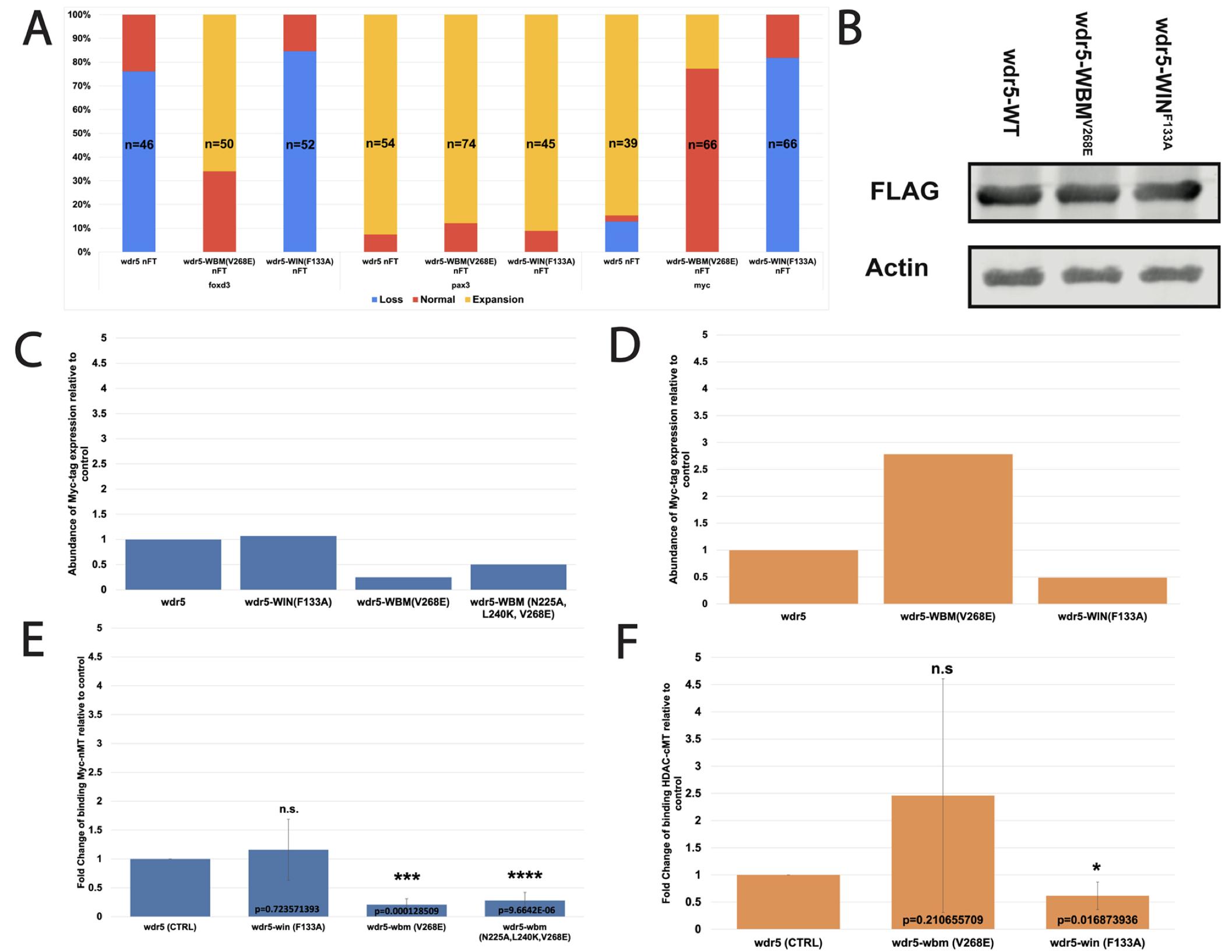 wdr5-WT, wdr5- WBMV268E, wdr5-WINF133A FLAG tag. (C) Co-IP binding analysis of myc+wdr5, wdr5-
