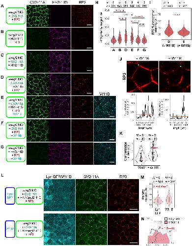 A-D, Intensity profiles of each signal along outer cell boundaries shown by dotted arrows (blue, W11B; green, GV2; red, F7R). W11B, GV2 and F7R showed co-accumulation when W11B was co-