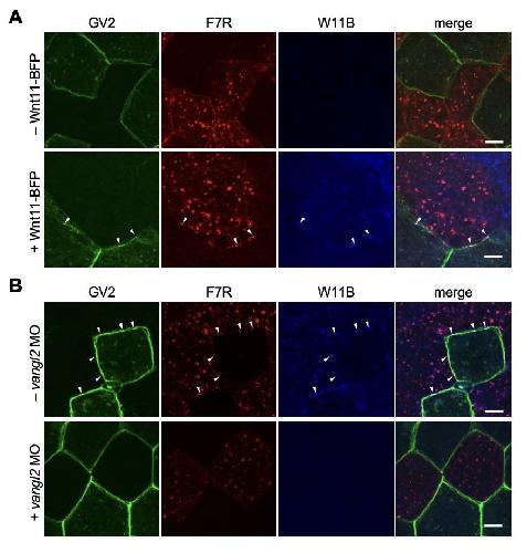 I, Overexpression of Wnt11-BFP (W11B) caused co-accumulation of W11B and pVangl2 in the neural plate. Overexpression of W11B in the neural plate often caused self-accumulation at cell