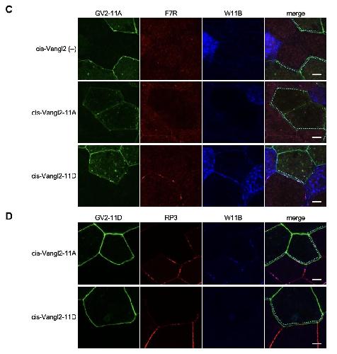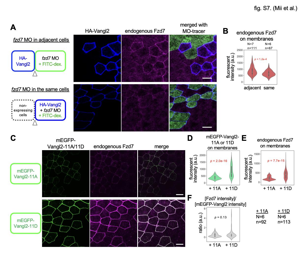Vangl2 intensity] did not differ significantly between 11A and 11D (F), suggesting that the increase of Fzd7 is proportional to the amount of Vangl2 protein on membranes, regardless of phosphorylation states.