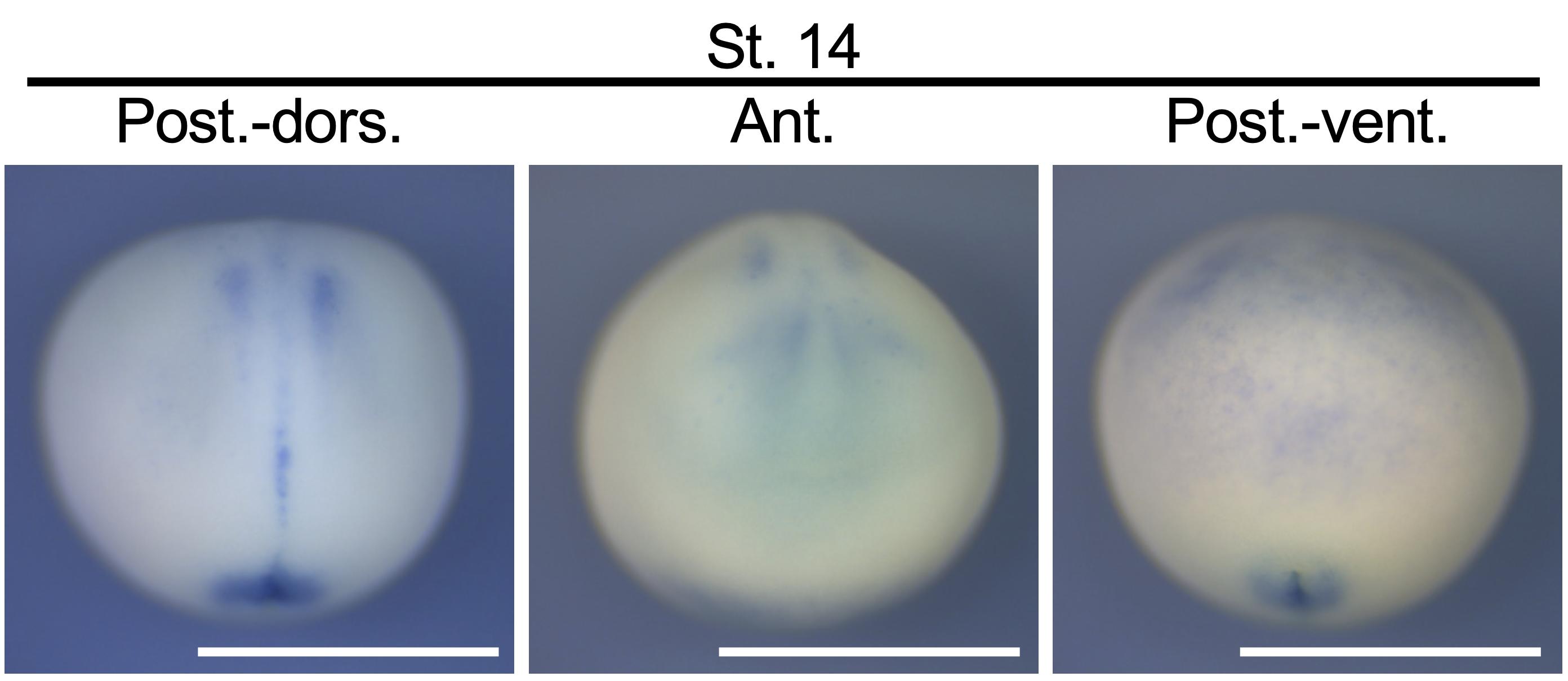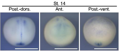 wnt11b (wingless-type MMTV integration site family, member 11B) gene expression in Xenopus laevis embryo via in situ hybridization, NF stage 14, posterior-dorsal, anterior and posterior-ventral views.