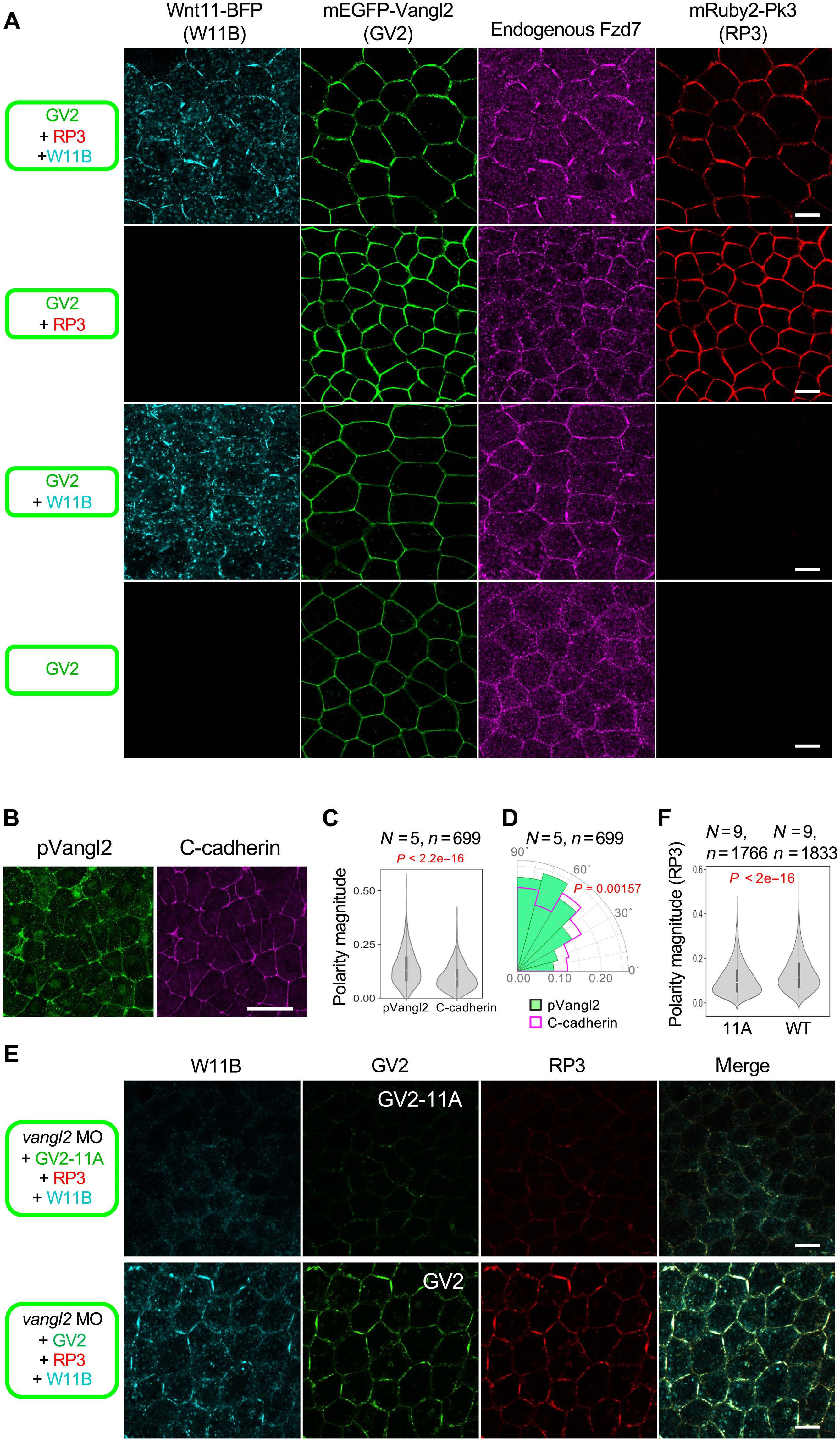E, Intensity profiles of Wnt11, pVangl2 and WGA at a cell boundary. Normalized intensities along the dashed arrow (F) are plotted.