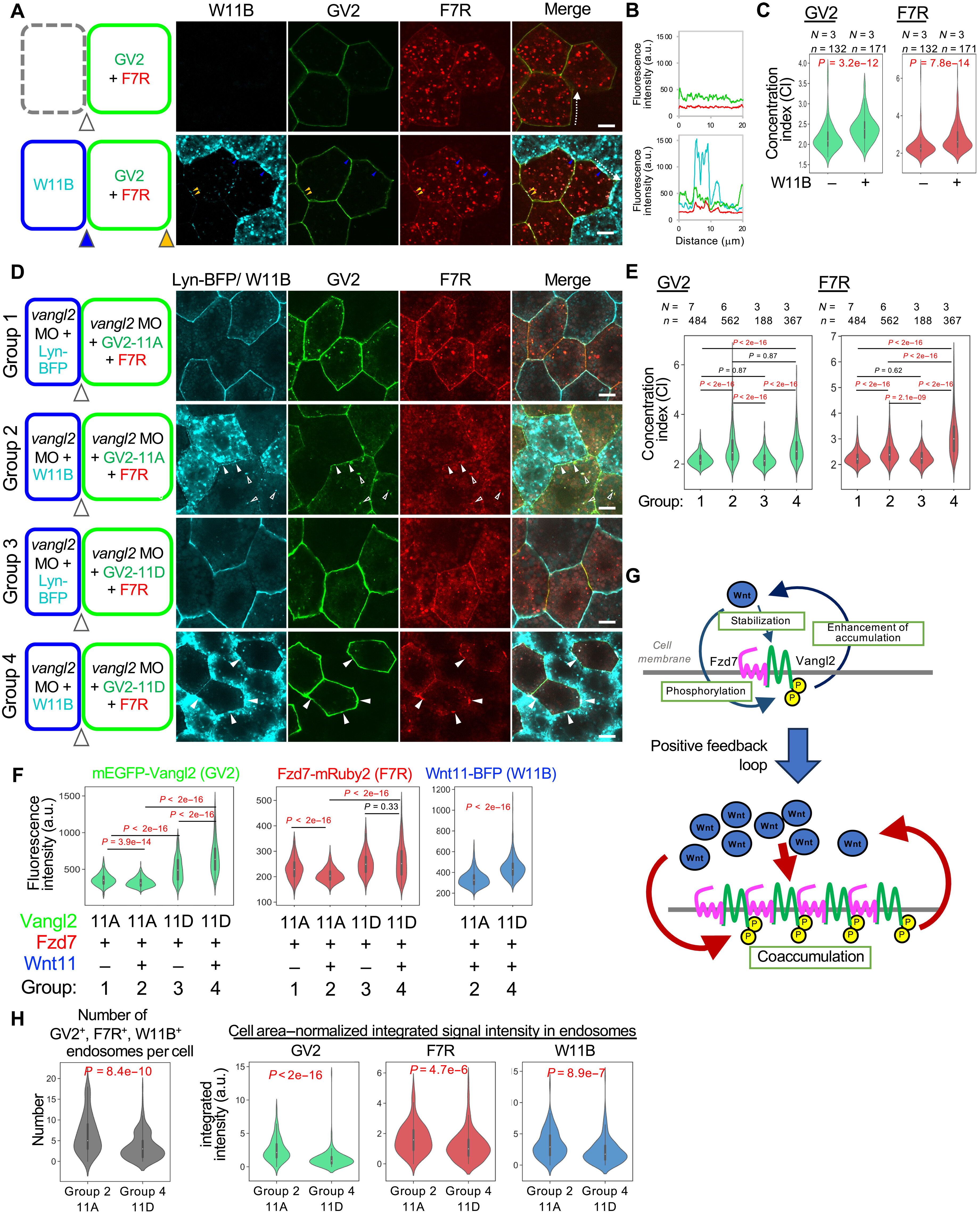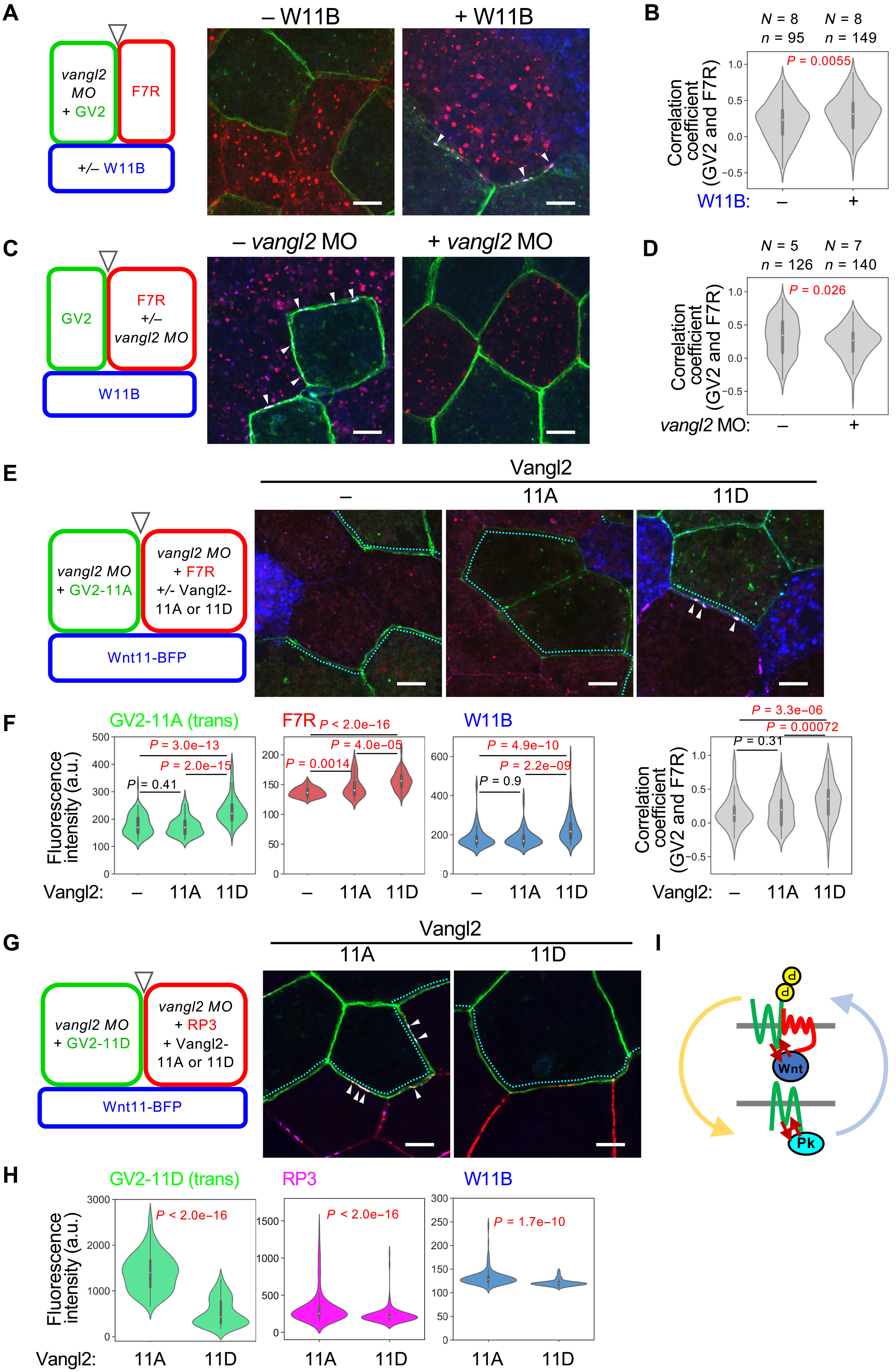 Amounts of mRNAs/MOs (ng/embryo): mEGFP-vangl2-11A, 0.10 (A-E), 0.050 (F); mEGFP-vangl2-11D, 0.10; fzd7-mRuby2, 0.050 (A-D), 0.10 (E) 0.040 (H); wnt11, 0.25; wnt11-BFP, 0.50; lyn-BFP, 0.050;
