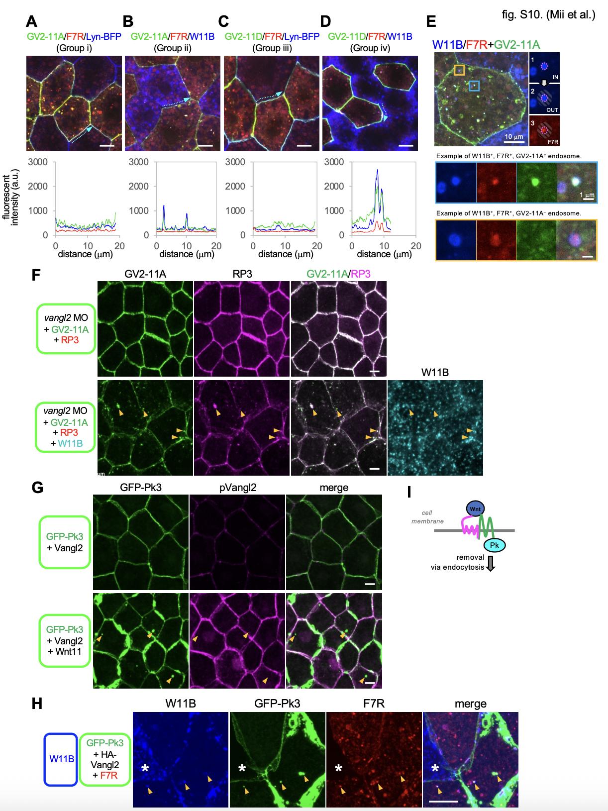 H, GFP-Pk3 is endocytosed with F7R and W11B. Because W11B is expressed in adjacent cells, W11B-positive puncta inside GFP-Pk3-, HA-Vangl2- and F7R-expressing cells must be internalized by