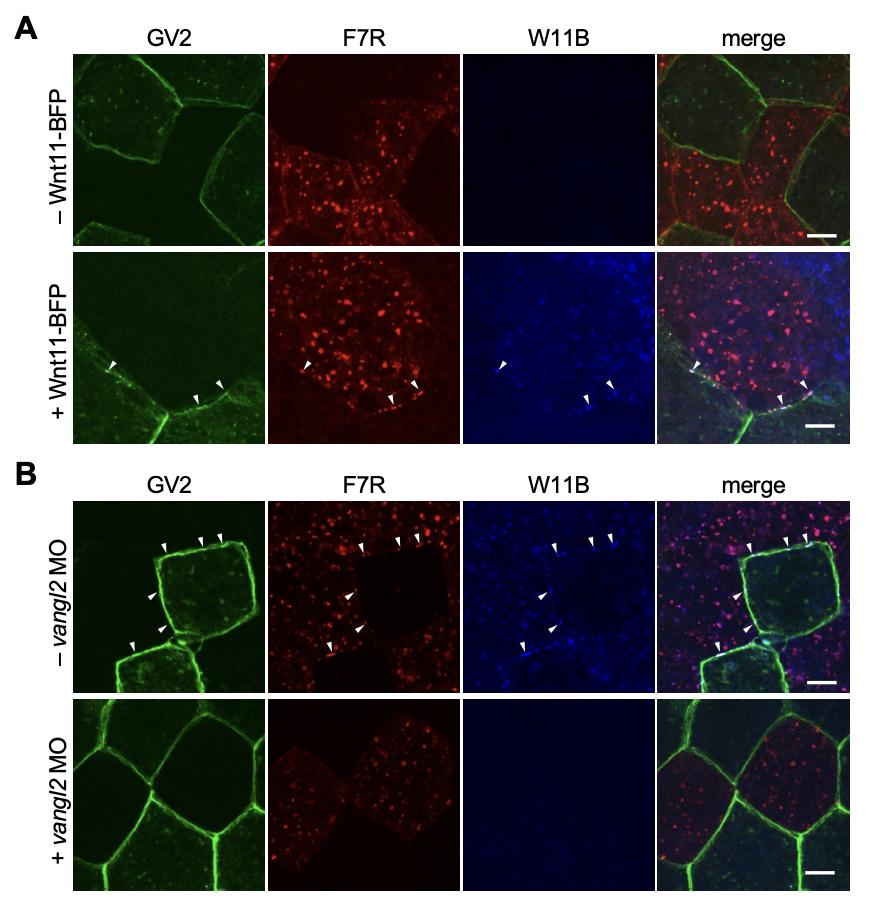 boundaries (arrowheads). At these accumulations, W11B co-localized with pVangl2, but not C-cadherin.