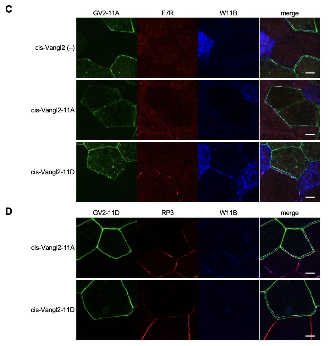 fig. S11. Images of individual channels of trans-assembly of core PCP components by Wnt11. [[ Panels C-D ]]