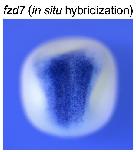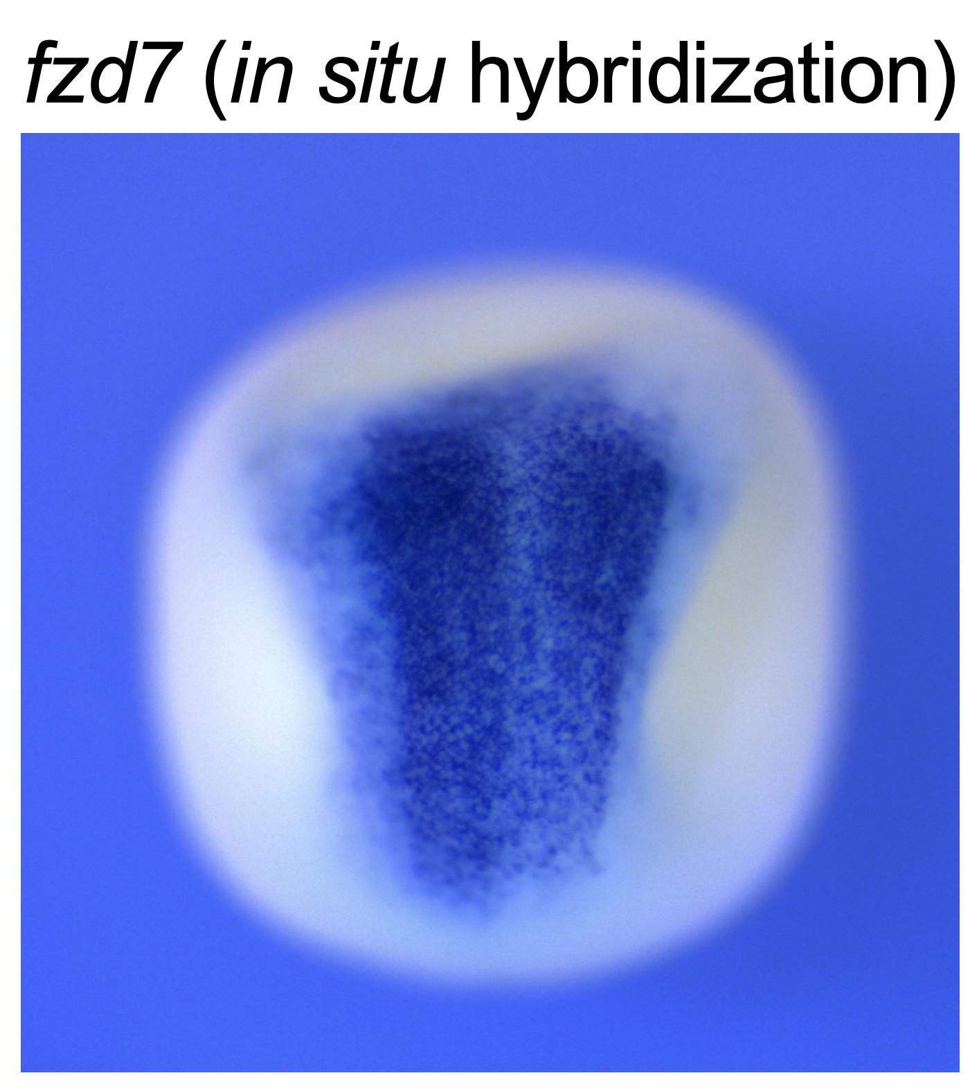 fzd7 (frizzled class receptor 7) gene expression in Xenopus laevis embryo via in situ hybridization, NF stage 14, dorsal view, anterior up.