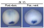 wnt11b (wingless-type MMTV integration site family, member 11B) gene expression in Xenopus laevis embryo via in situ hybridization, NF stage 13, posterior-dorsal and posterior-ventral views.
