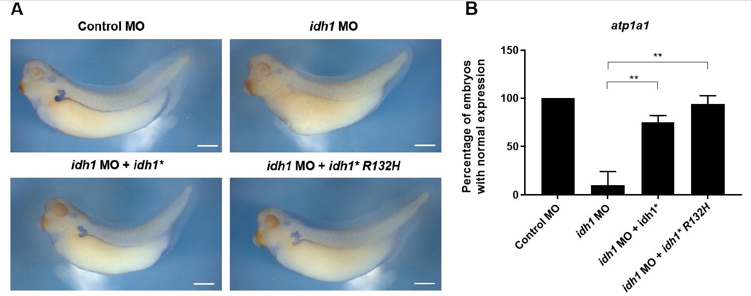 Fig. 3. Wild-type and R132H mutant idh1 restore pronephric marker expression in idh1-depleted Xenopus embryos. (A) WISH for atp1a1 showing pronephric structures in control embryos, idh1 morphants, and idh1 morphants co-injected with either wild-type (WT) idh1* mRNA or idh1*R132H mRNA. (B) Quantification of embryos exhibiting normal atp1a1 expression, based on intact staining intensity and normal pronephric morphology, as shown in (A). Both WT and R132H mRNA restored pronephric marker expression in idh1-depleted embryos (**p<0.01; one-way ANOVA followed by Dunnett’s multiple comparisons test). Scale bars: 500 μm. MO, morpholino oligonucleotide; WISH, whole-mount in situ hybridization; ANOVA, one-way analysis of variance.