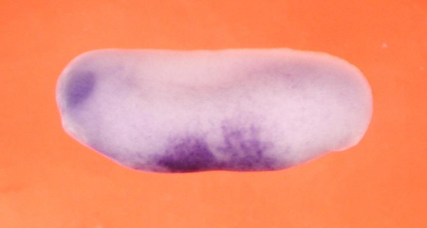 Larger Image cpo (carboxypeptidase O) gene expression in Xenopus laevis embryo, assayed via in situ hybridization, NF stage 24, lateral view, anterior left, dorsal up. Copyright © Patient Lab Image created by: Aldo Ciau-Uitz