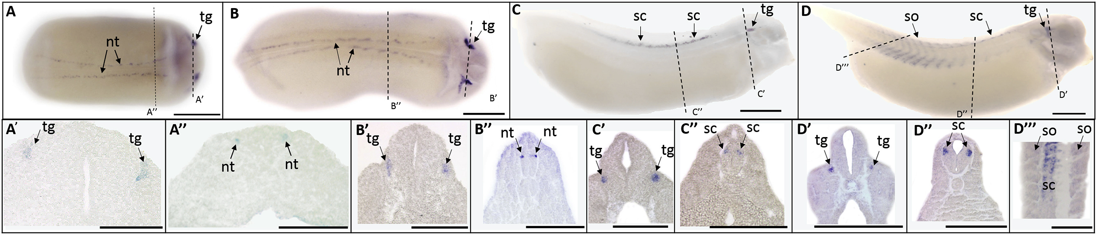 Larger Image Fig. 1. Whole mount (AâD) and histological (Aâ²-Dâ´) expression of trpv1 transcripts in developing X. laevis embryos. (AâB) dorsal view, (CâD) lateral view, anterior to the right for all whole mount embryos; dorsal to the top for all histology images. (A, Aâ², Aâ²) stage 20 (late neurula stage); (B, Bâ², Bâ²) stage 25 (early tailbud stage); (C, Câ², Câ²) stage 30 (late tailbud stage); (D, Dâ², Dâ², Dâ´) stage 35 (swimming tadpole stage). Arrows indicate regions of gene expression (nt, nural tube; sc, spinal cord; tg, trigeminal ganglia). Dashed lines represent positions of corresponding sections. Scale barsâ¯=â¯250â¯Î¼m. Image published in: Dong C et al. (2018) Copyright © 2018. Image reproduced with permission of the Publisher, Elsevier B. V.