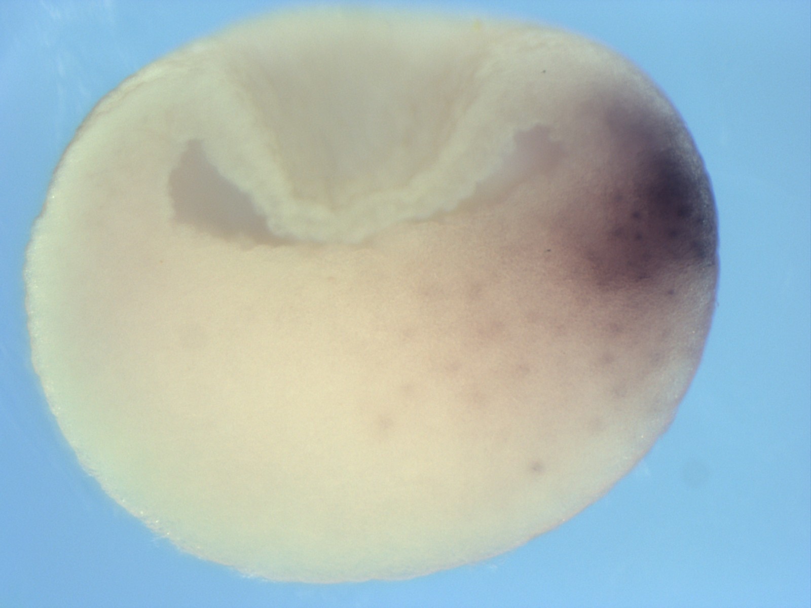 | Larger Image sia1 (siamois homeodomain 1) gene expression in bisected Xenopus laevis embryo, mid-sagittal section, assayed via in situ hybridization, NF stage 9, dorsal right, anterior up Copyright © Zorn Lab