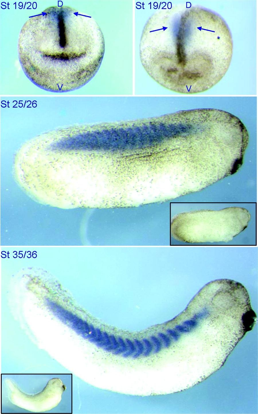 Figure 4. XlCx40.4 expression in the developing Xenopus embryos is present in the presomitic paraxial mesoderm and somites. Whole-mount in situ hybridization was performed on stage 19/20, stage 25/26, and stage 35/36 embryos. Upper left panel: anterior view; signal is visible in the first somites (arrows); dorsal (D) and ventral (V) sides of the embryo are indicated. Upper right panel: dorsoposterior view; signal is visible in the first somites/presomitic paraxial mesoderm (arrows); dorsal (D) and ventral (V) sides of the embryo are indicated. Middle and lower panels: right lateral view; signal is visible in the somites. No signals were found in sense negative controls (inserts). Image published in: De Boer TP et al. (2005) Copyright © 2005. Image reproduced with permission of the Publisher, John Wiley & Sons.