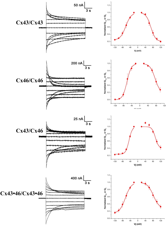 Figure 5. Junctional current (Ij) data from paired oocytes. The left column shows examples of current traces recorded from homotypic pairs (Cx43/Cx43 and Cx46/Cx46), a heterotypic pair (Cx43/Cx46), and a heteromeric pair (Cx43•46/Cx43•46). The right column plots normalized steady-state junctional conductances (filled circles) measured at the end of 10-s-long voltage steps, and fit to the Boltzmann equation (curved lines). Image published in: Hoang QV et al. (2010) Copyright © 2010 Molecular Vision. Creative Commons Attribution license Larger Image Printer Friendly View |