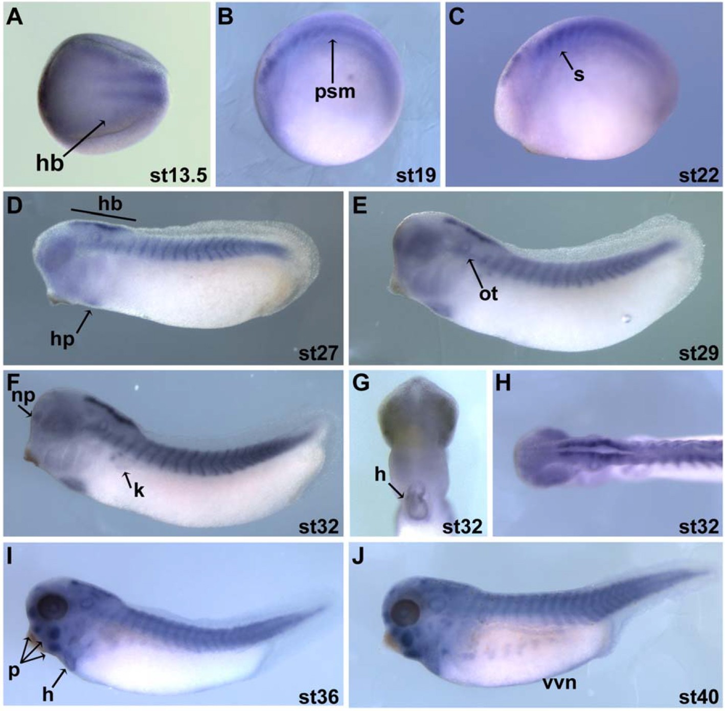 Figure S3. Xenopus tropicalis Cst Spatial Expression Whole mount in situ hybridization of Cst in X. tropicalis of Stage 14 (neurula) to Stage 40 (tadpole) embryos using a Cst-specific probe common to both Cstα and Cstβ. A is an anterior view. B-F, I-J are lateral views with anterior to the left. G is a ventral view with anterior to the top. H is a dorsal view with anterior to the left. hindbrain (hb), presomitic mesoderm (psm), somites (s), heart primordium (hp), otic vesicle (ot), nasal placode (np), facial placodes (p), heart (h), kidney (k), vascular vitelline network (vvn).
